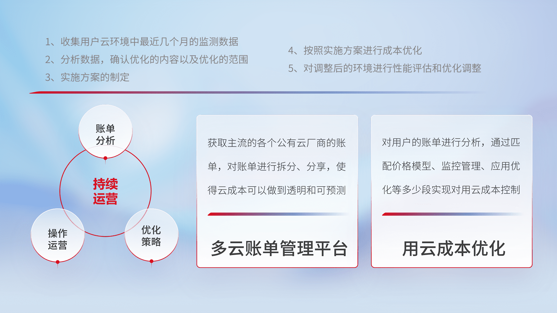 通过多云纳管,,,以统一的资源数据模型把客户的云资源进行抽象和封装,,,,进而实现对多云资源的统一操作,,保障云资源管理的可靠性、、、稳定性与可用性。。。量身定制化运维内容,,,配置、、开发运维、、补丁管理、、、、备份、、、监控、、认证和访问管理、、审计和日常巡检等,,,,保障在用云过程中的可靠度,,稳定度以及高可用率。。。。